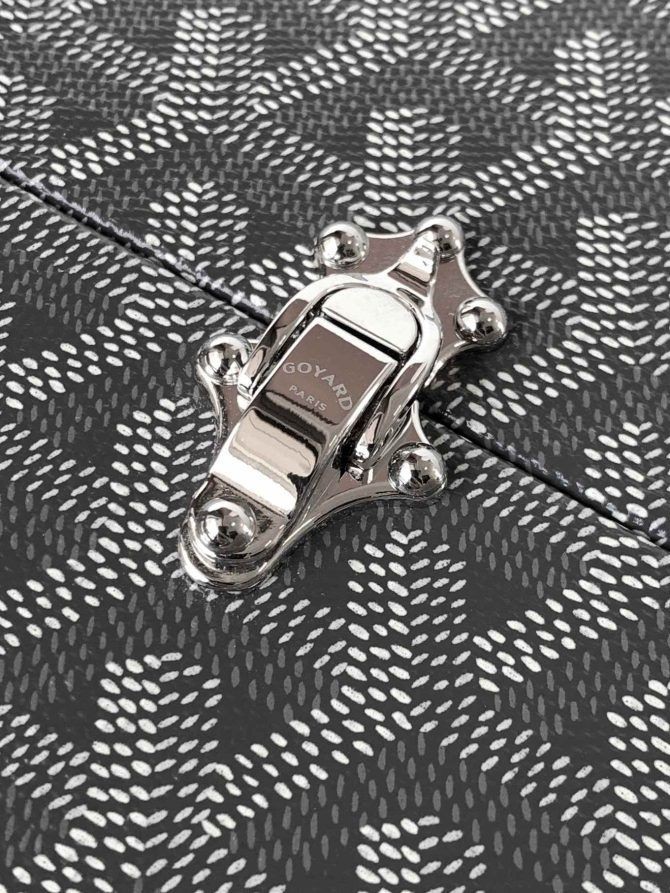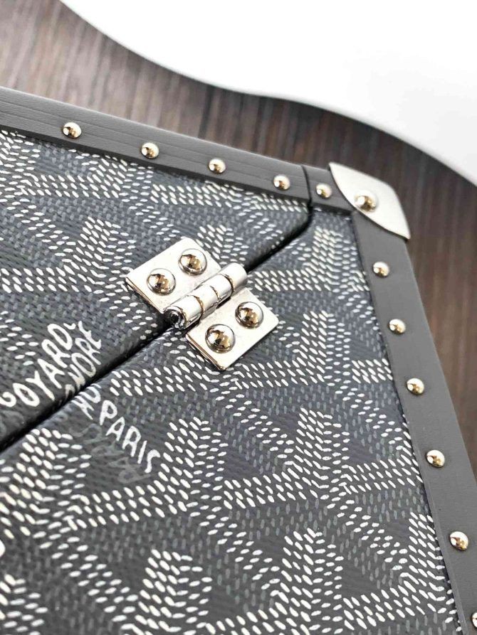 على Dé الجذع حقيبة يجسد بطريقة مبتكرة على الخلود اثنين من Maison Goyard كيف يعلم: شنطة صناعة الجلود الصالح. وذلك بفضل اثنين من المشابك الحجم الصغير ، وهو مثالي بأمان عقد مساء الضروريات. منمق مع سوار المعصم ، د الجذع حقيبة يمكن حملها باليد.