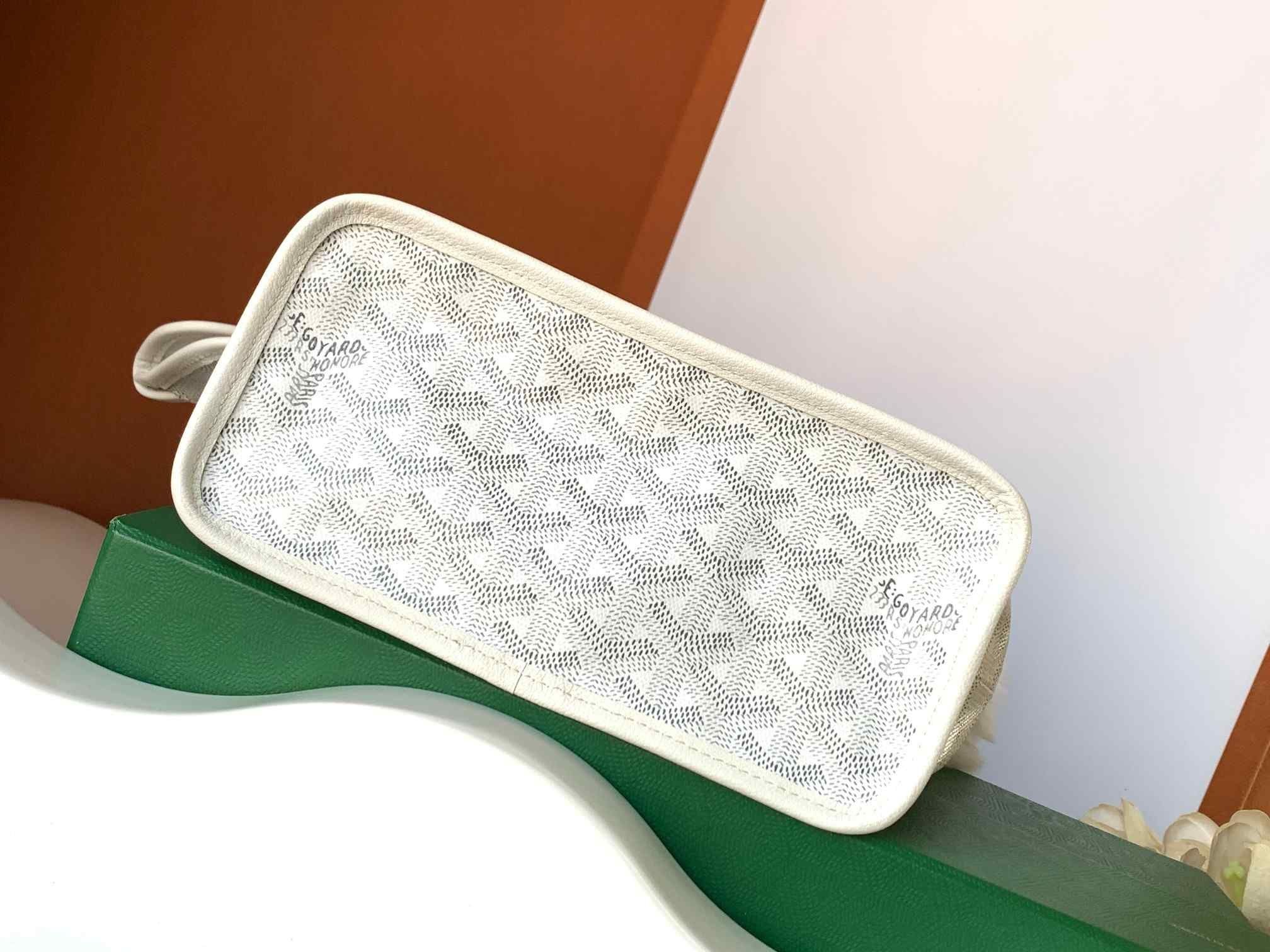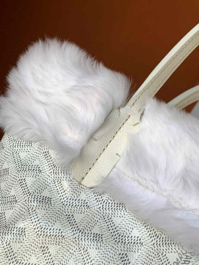 Dette er et Goyard Goyardine Rex Kanin Pels Reversible Mini Anjou i Sort. Dette petite, reversibel tote er lavet af en traditionel Goyard chevron monogram på black coated lærred med Kanin pels. Tote er udstyret med sort læder trim og top håndtag. Den øverste åbner ud til en sort pels indvendig med en aftagelig pose.