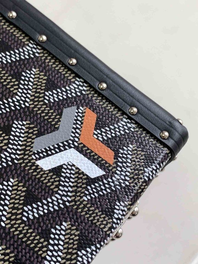 Den Minaudière kuffert, taske er en kuffert og en clutch taske på samme tid. Praktisk og let, det kan bæres med eller uden rem. Remmen er i form af chevron fra vores Goyardine stof.