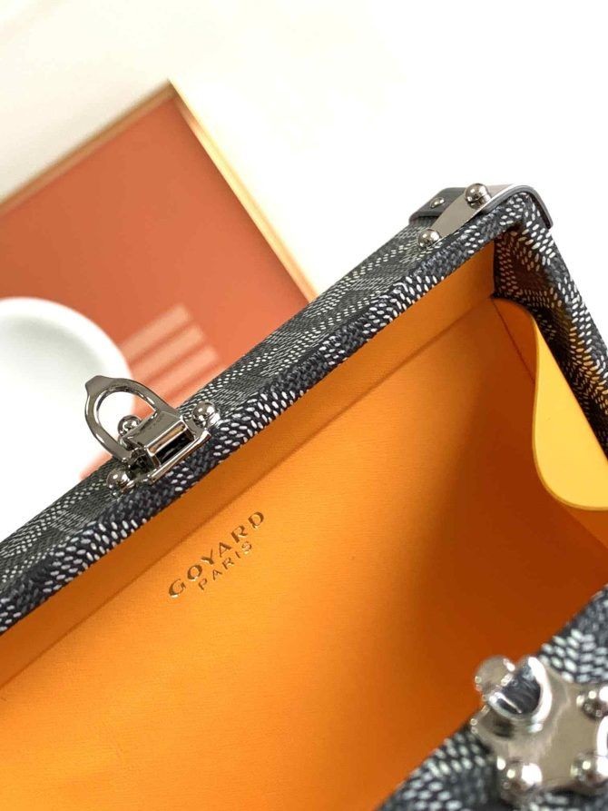 Den Minaudière kuffert, taske er en kuffert og en clutch taske på samme tid. Praktisk og let, det kan bæres med eller uden rem. Remmen er i form af chevron fra vores Goyardine stof.