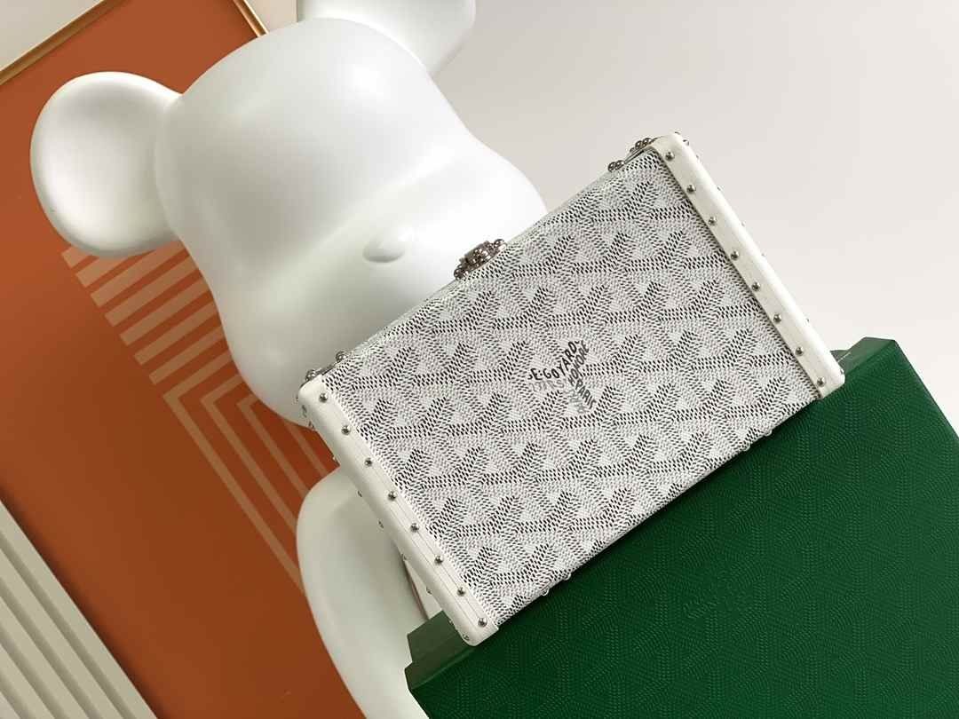 Den Minaudière kuffert, taske er en kuffert og en clutch taske på samme tid. Praktisk og let, det kan bæres med eller uden rem. Remmen er i form af chevron fra vores Goyardine stof.
