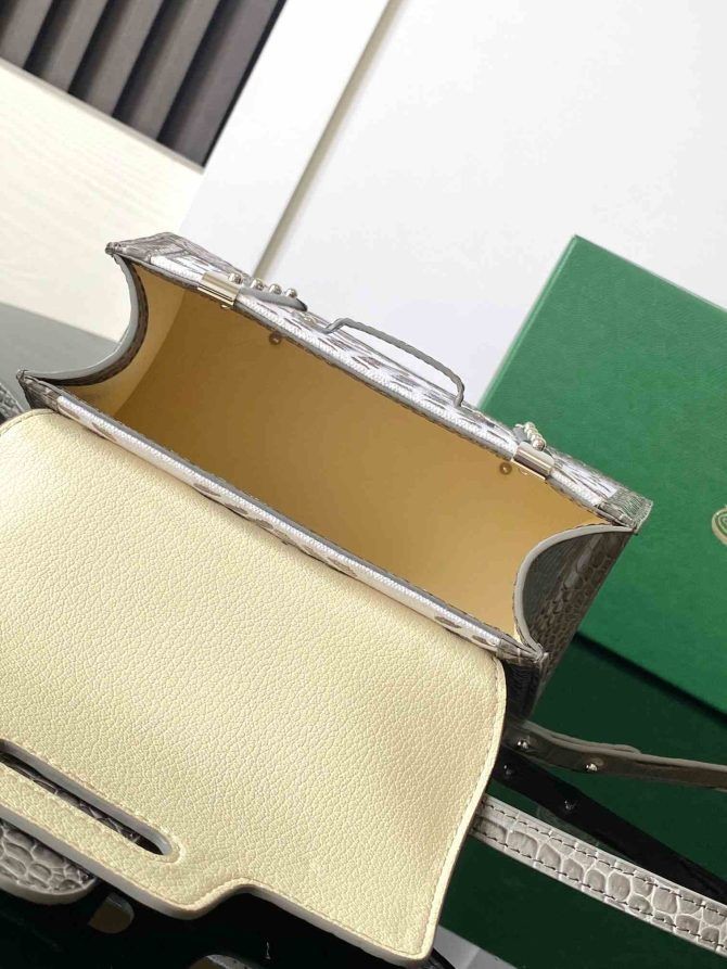 Den Saïgon taske er en af Maison Goyard symbolske i stykker, som det arver alle vores kuffert-gør signatur-koder som træ stave, læder hjørner og kuffert nitter. I denne strukturerede, miniature-format, Saïgon taske kan bæres med eller uden en rem til en smart og elegant stil.