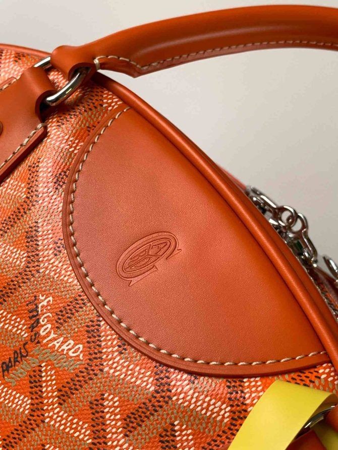Dette er en høj qualiry Goyard Chevron Saint St. Jeanne MM Bowler Denne taske er lavet af Goyard monogram på toile-lærred. Den taske har rullet læder top håndtag og andre læder trim, med poleret sølv hardware, herunder en hængelås for lynlåse. Dette åbner for en mango orange stof indvendig. Dette er en fremragende tote, som er ideel til daglig brug, fra Goyard!