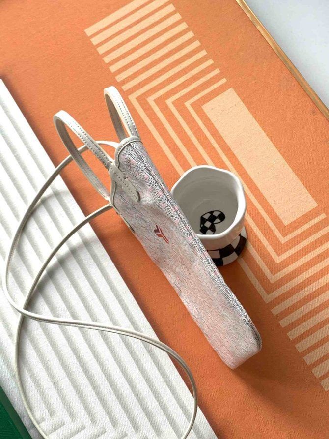 The Poitiers bag is the little brother of the Saint Louis, Artois and Anjou tote bags, and references the same emblematic codes yet in a mini & extremely flat version. The ideal size to hold a few small personal items (wallet, phone or keys), it was designed after a model from our archives. The Poitiers bag can sported as a handbag or a cross-body bag thanks to its removable strap. The Claire-Voie special edition is named after a term used in architecture & the decorative arts. It highlights the colourful outer triangles created by the intertwining of the chevrons. The inner coated canvas in the same color as the triangles creates the optical illusion of seeing through the canvas.