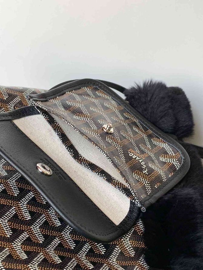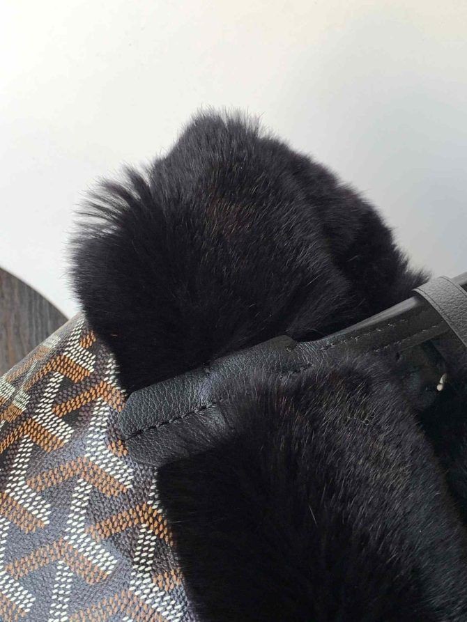 Je обратимая mini-bag-тоут od krzna zeca rex Goyard Goyardine crne boje. Ova minijaturna obostrane torba je izrađena od tradicionalnog strelice s monogramom Goyard na platnu s crnim premazom i krznom od zeca. Torba je crne kožne obloge i gornje ručke. Gornji dio se otvara prema unutra od crnog krzna sa odvojivim torbu.