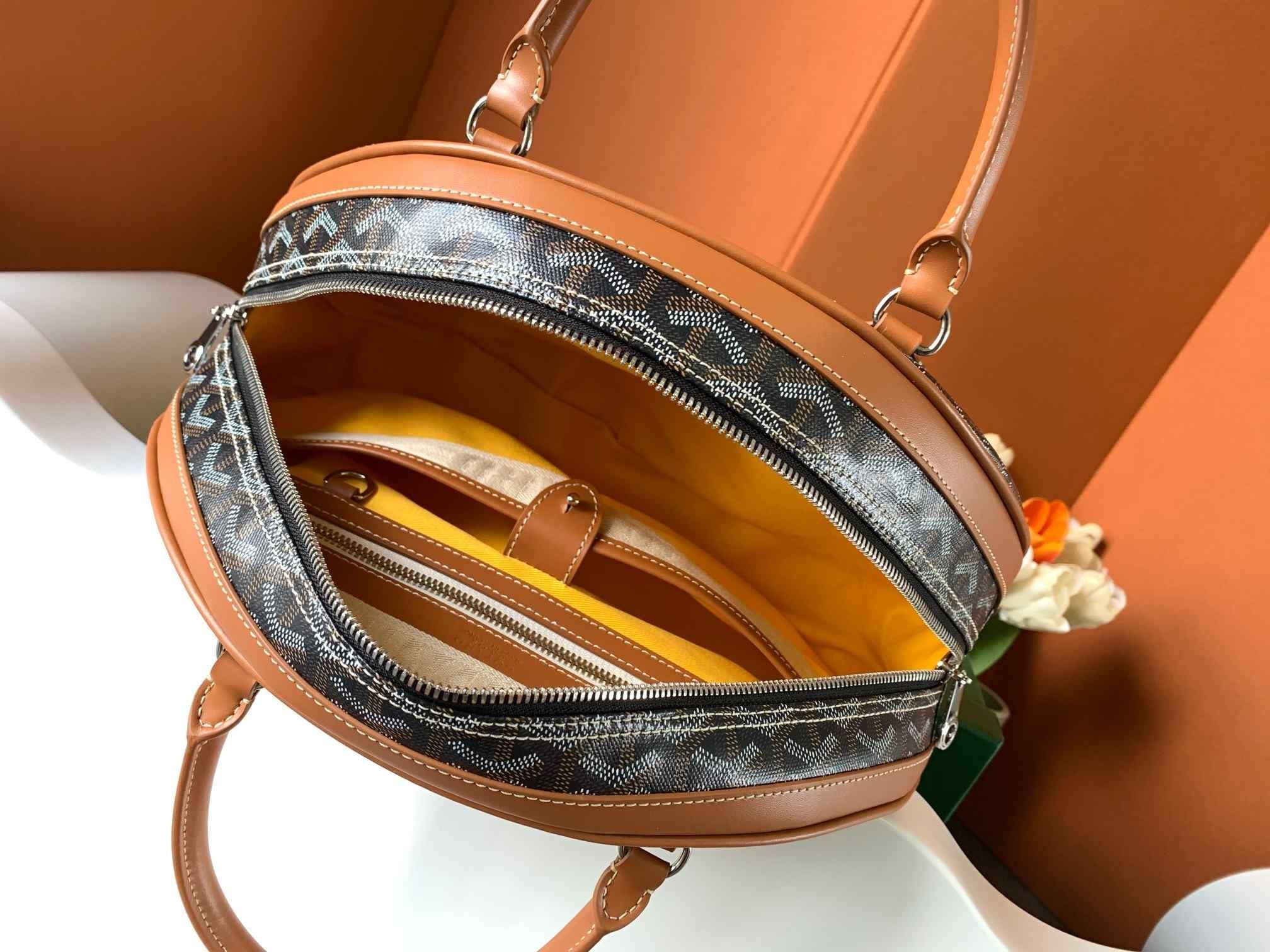 Dit is een hoge qualiry Goyard Chevron Saint St. Jeanne MM Bowler Deze handtas is gemaakt van Goyard monogram op toile canvas. De tas is voorzien van rolde lederen top handgrepen en andere lederen bekleding, met gepolijste zilveren hardware met inbegrip van een hangslot voor de ritsen. Dit opent een mango oranje stof interieur. Dit is een uitstekende tas, ideaal voor dagelijks gebruik, van Goyard!