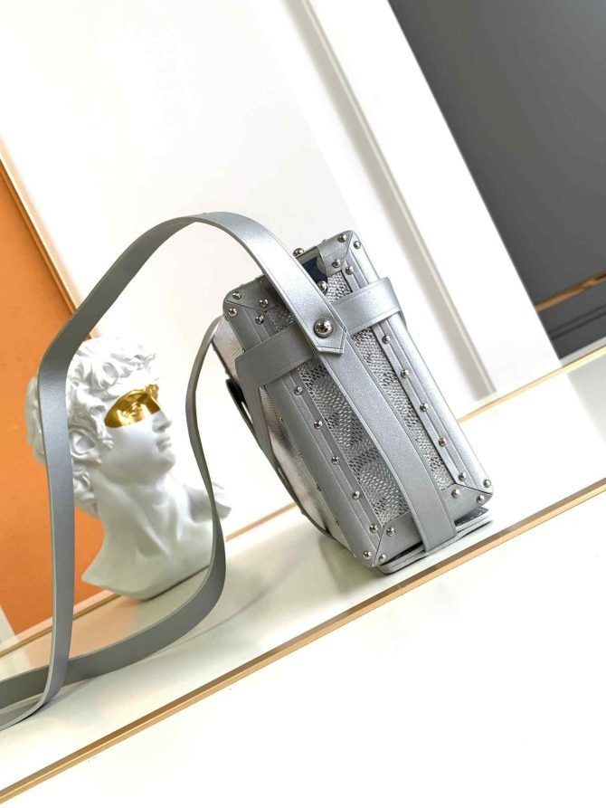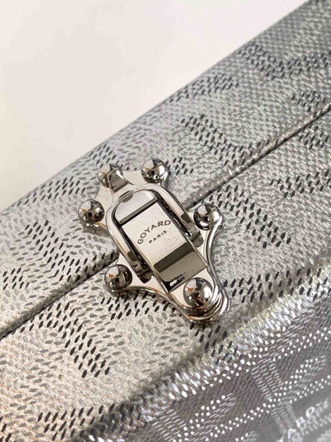 De Minaudière trunk-bag is een romp en een tasje op hetzelfde moment. Praktisch en licht, het kan gedragen worden met of zonder de band. De band is in de vorm van de chevron van onze Goyardine stof.