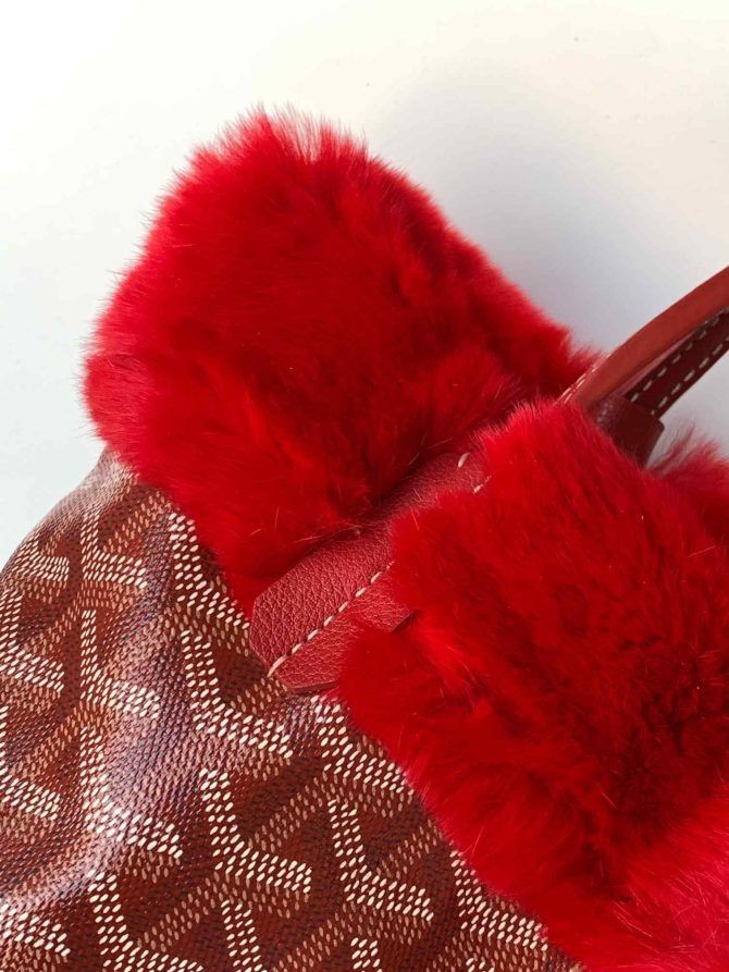 To odwracalne mini-torba-тоут z futra królika rex Goyardine z futra rexa Anjou w kolorze czarnym. Ta miniaturowa dwustronna torba wykonana z tradycyjnego wysuwanym z monogramem Goyard na płótnie z czarnym pokryciem i futra królika. Torba posiada czarną skórzaną tapicerkę i górne uchwyty. Górna część otwiera się do środka z czarnego futra z wymiennymi pokrywami.