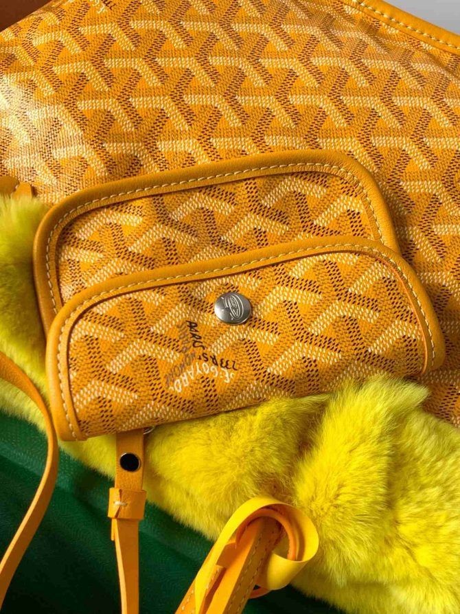 To odwracalne mini-torba-тоут z futra królika rex Goyardine z futra rexa Anjou w kolorze czarnym. Ta miniaturowa dwustronna torba wykonana z tradycyjnego wysuwanym z monogramem Goyard na płótnie z czarnym pokryciem i futra królika. Torba posiada czarną skórzaną tapicerkę i górne uchwyty. Górna część otwiera się do środka z czarnego futra z wymiennymi pokrywami.
