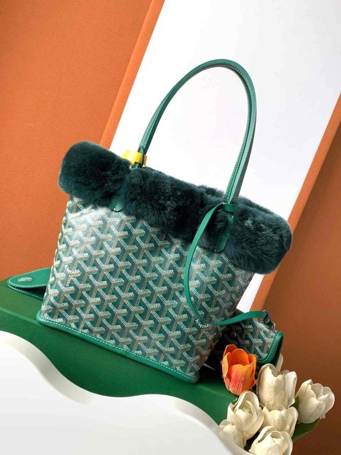 Aceasta este o Goyard Goyardine Iepure Rex Blana Reversibile Mini Anjou în Negru. Acest petite, reversibile tote este fabricata de o tradițională Goyard chevron monograma pe negru pânză acoperite cu blana de Iepure. Tote caracteristici tapiterie din piele neagra si mânere de top. Partea de sus se deschide pentru o blană neagră interior cu o husă detașabilă.