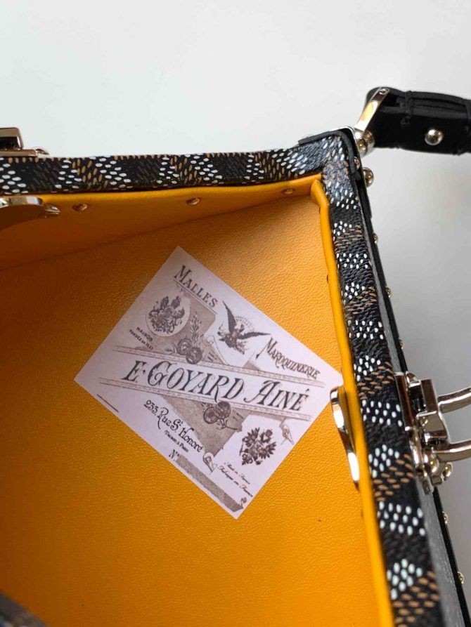 Pe Dé portbagaj sac întruchipează într-un mod inovator atemporalitatea două Maison Goyard-i cum-știe: portbagaj de a face și de piele bună luare a deciziilor. Datorită sale două cleme și dimensiuni compacte, este ideal pentru a organiza în condiții de siguranță în seara esențiale. Impodobita cu o curea de mână, la Dé portbagaj geanta poate fi purtat în mână.