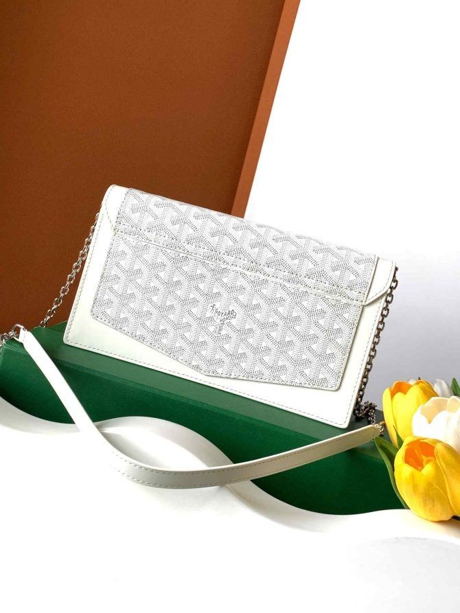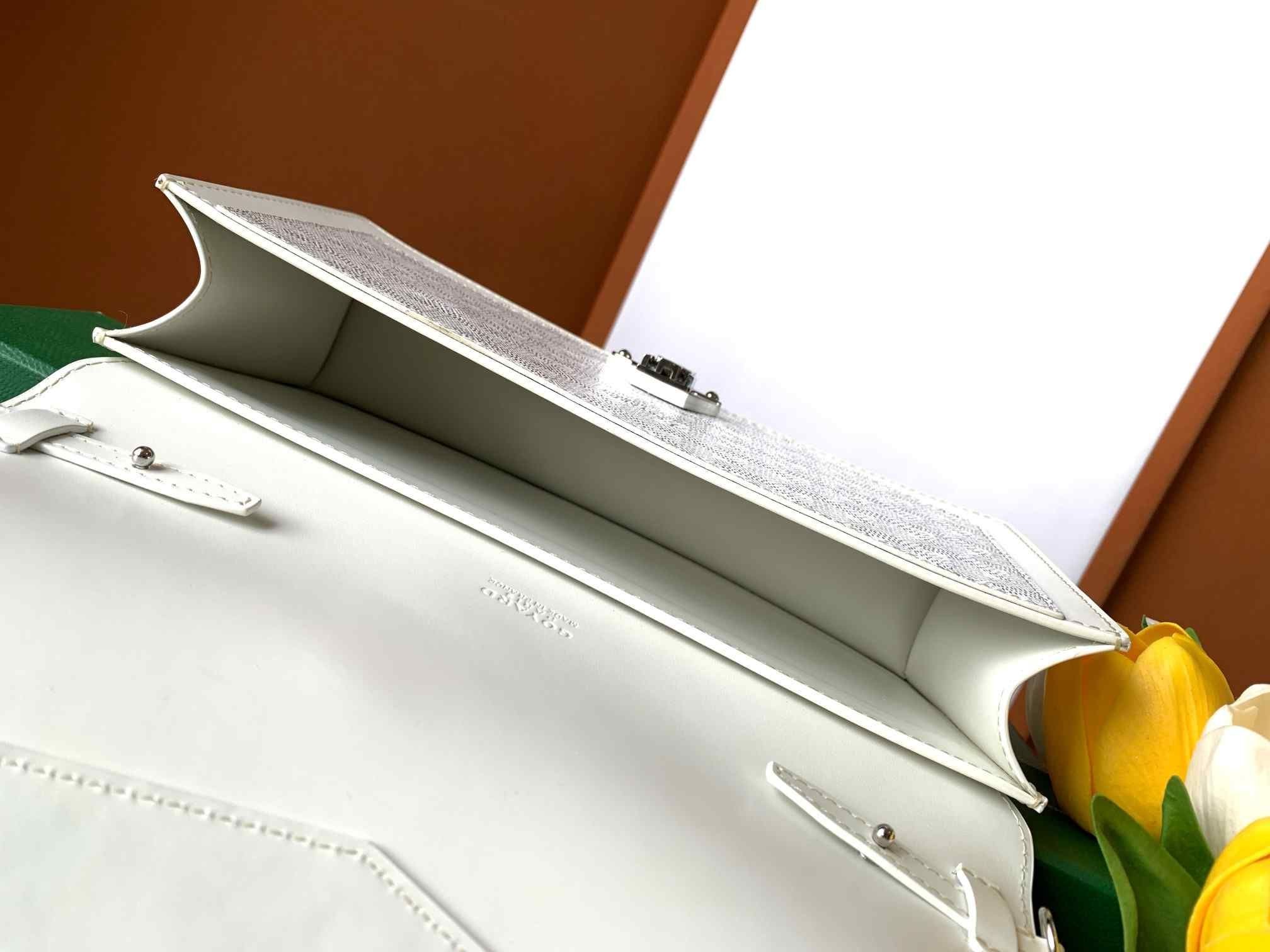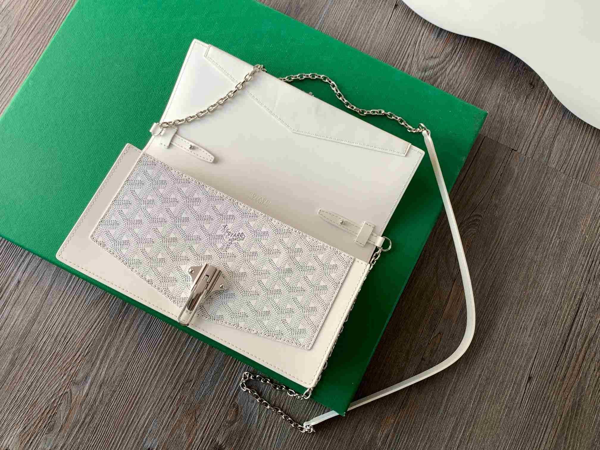 en elegant och praktisk, Hertiginnan Marie-Caroline väskan kan bäras runt axeln, cross-body style eller utförs för hand tack vare sin avtagbar kedja rem. Dess stänga systemet är fäst med ett spänne, en nick till den historiska trunk-att veta hur man Maison Goyard. Hertiginnan Marie-Caroline väska är perfekt kompletteras med Infoga-Louise, som båda har samma edgy look.